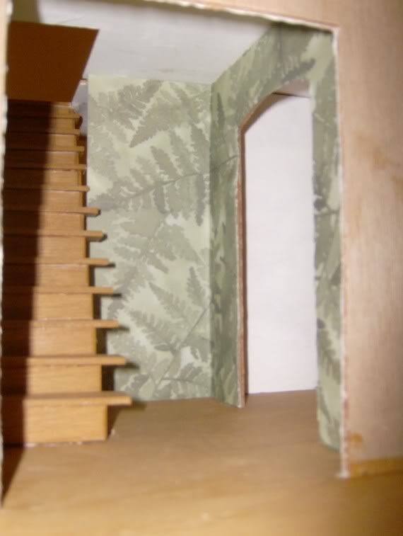 Once 'Partition #2' was installed and dried, I wallpapered its foyer side using access from the front door opening. Avoid installing the front door too soon; you'll need access for trim and window work later. Even if this area will be mostly hidden from view, finish it like the rest of your dollhouse since people can see through the double front doors. Since I was already there and finished with that area, I decided to wallpaper the kitchen as well. Crease your wallpaper around the staircase for a perfect fit.