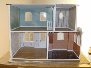 Today, I installed the interior trim and back edge trim. I usually paint the back edge trim the same color as the dollhouse body, which would have been red in this case. This creates the effect of looking through an opening in the walls of the dollhouse. However, I decided to paint the back trim white because red would clash with the white trim inside.